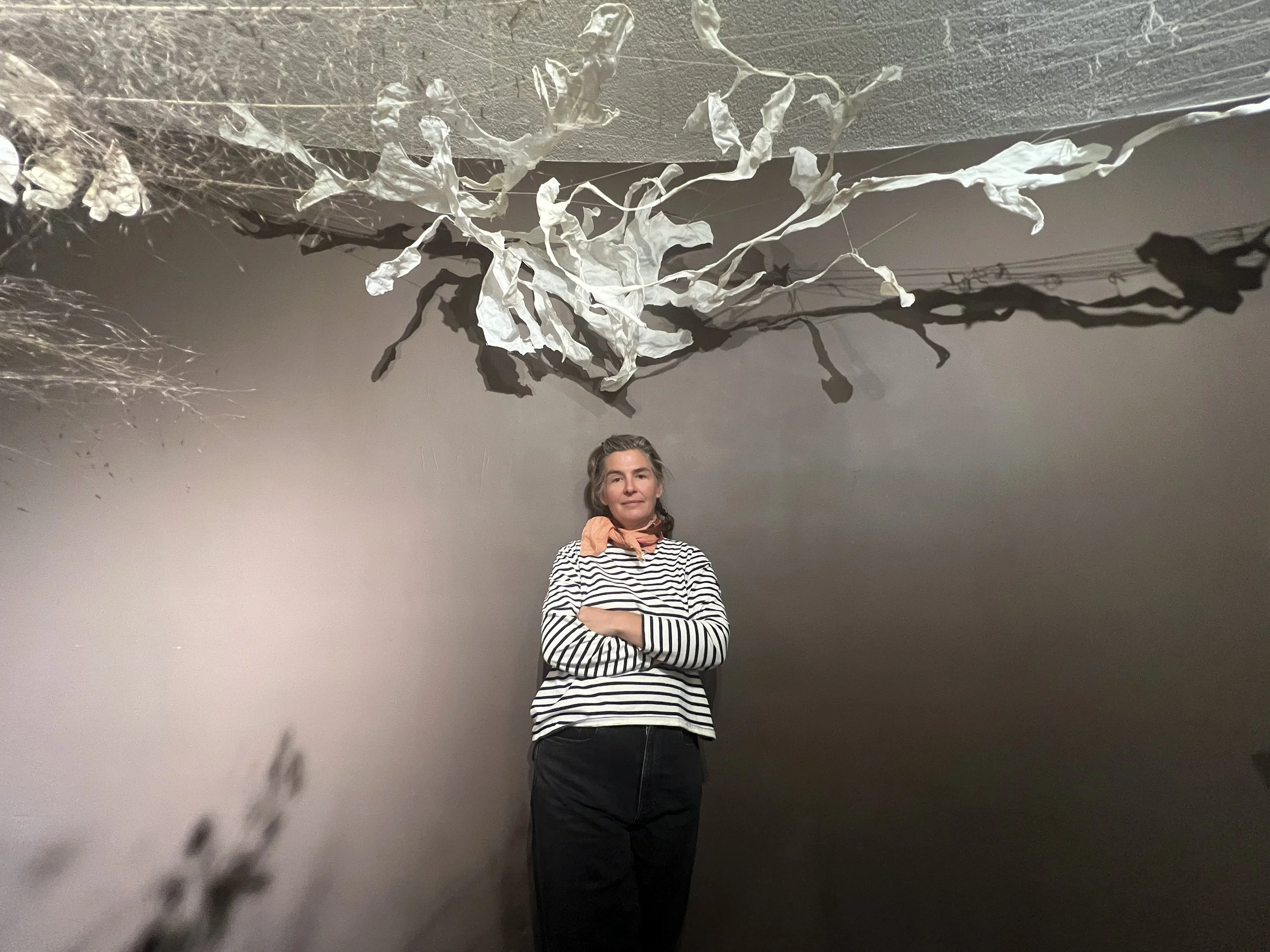 Her process is one of collaboration with the material—an improvisation between intention and surrender. Each gesture is guided by the way the cellulose stretches, curls, and changes as it dries. In her practice, sense-making is a form of ruminating through grief, a way of listening. What hangs above us is as much emotion as it is form.